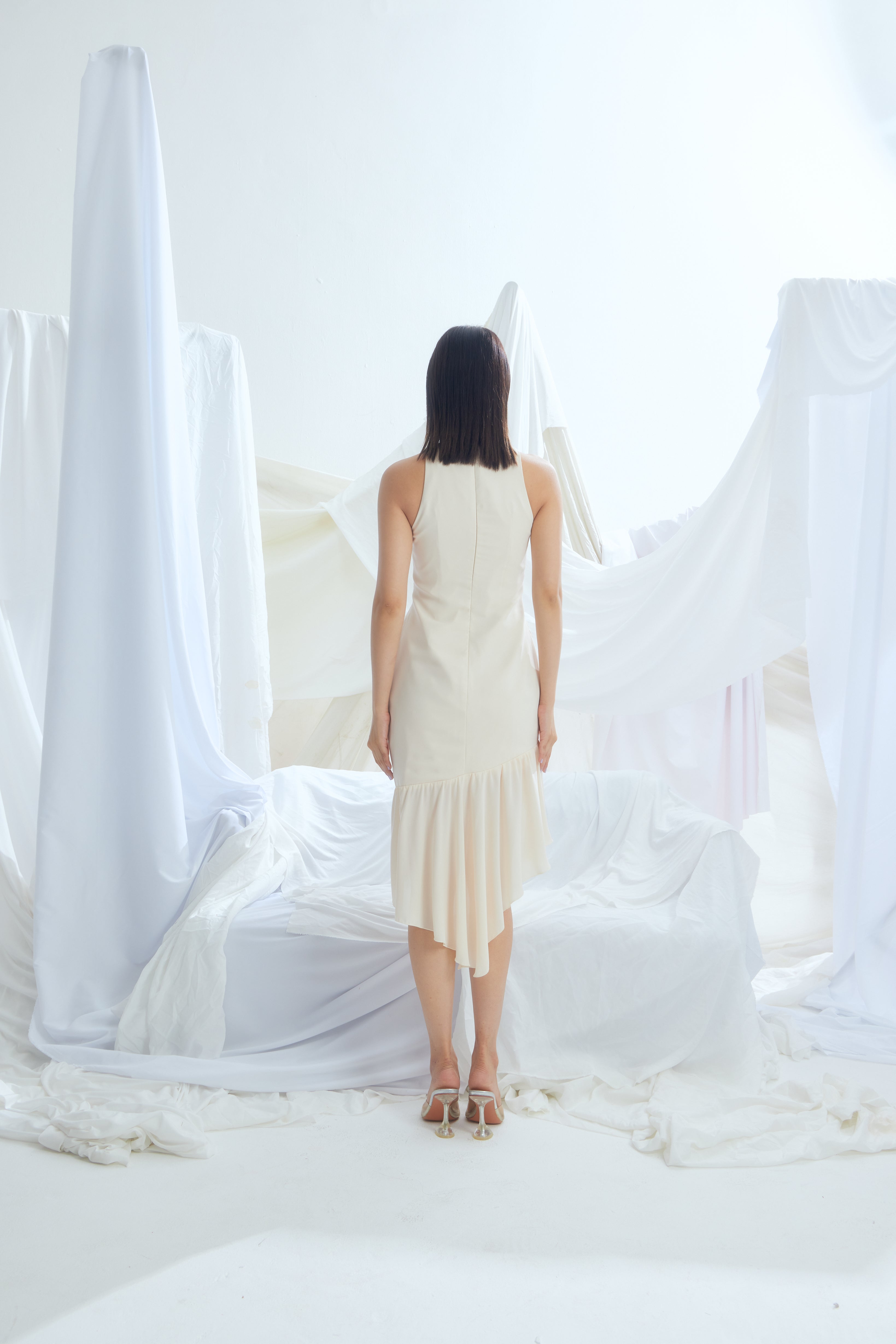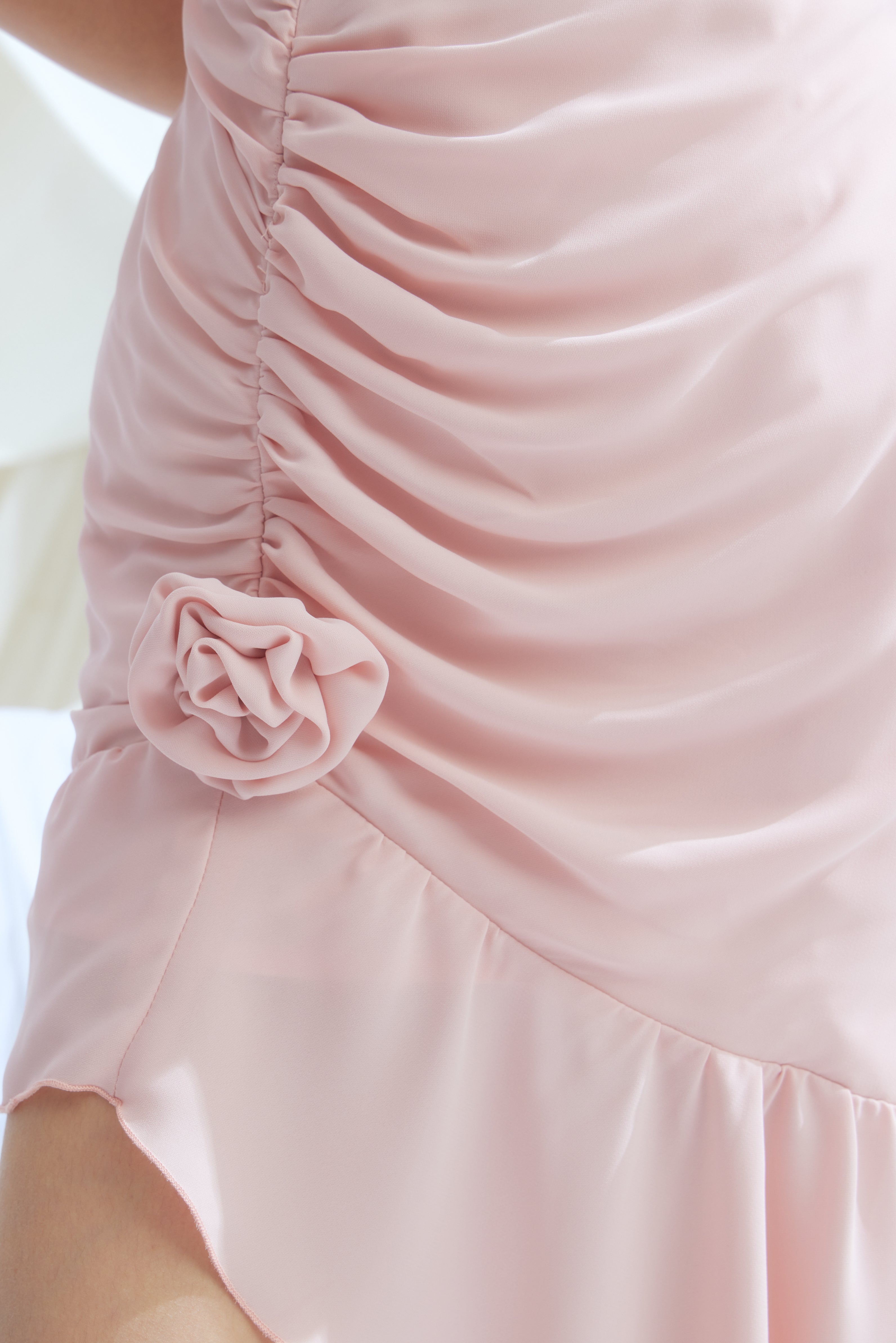 Featuring a high neckline with a sleek sleeveless cut, the dress exudes modern elegance. The gathered ruching at the waist flatters your figure, while the asymmetrical ruffle hem adds movement and charm. A delicate 3D floral appliqué at the hip completes the stunning look.