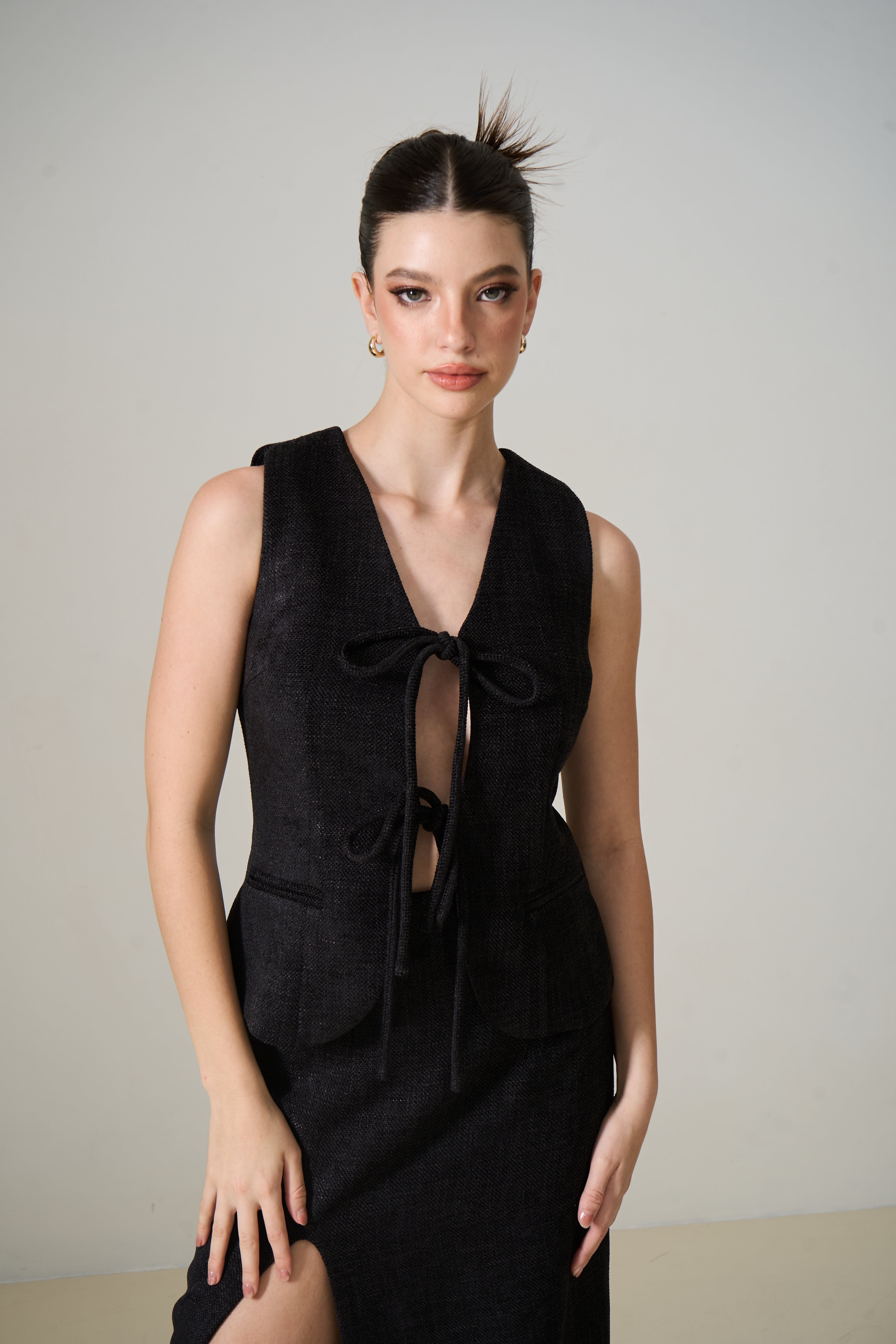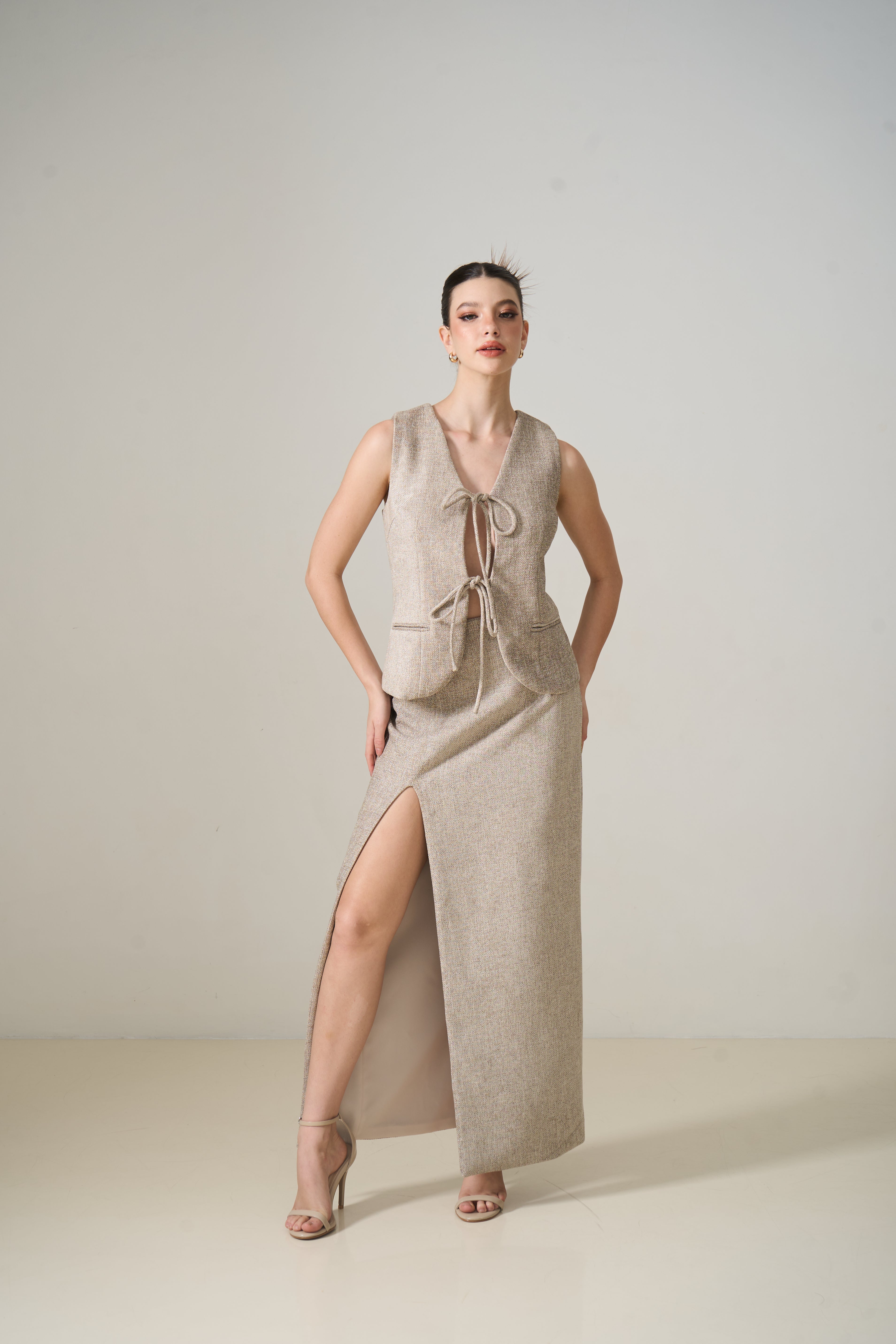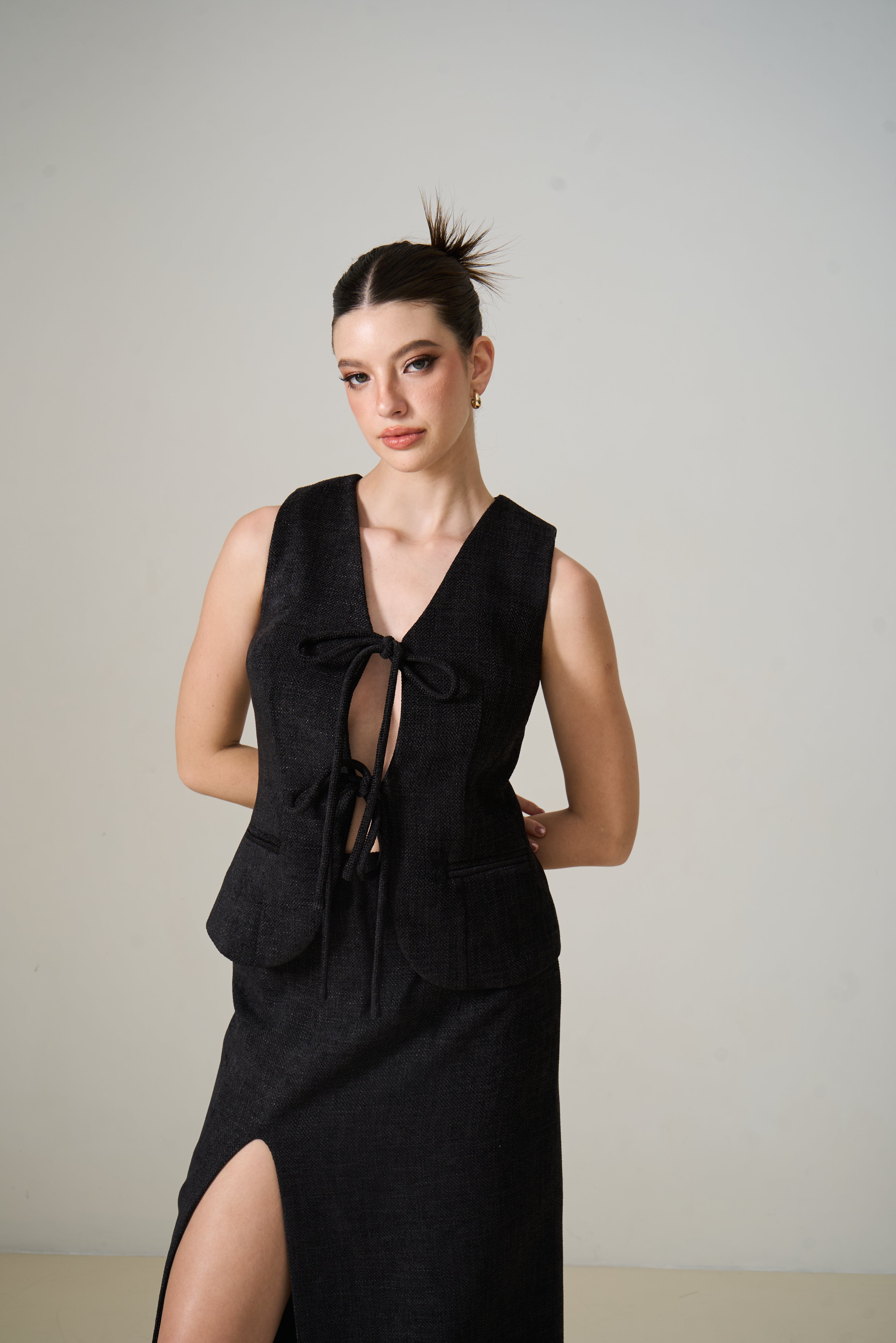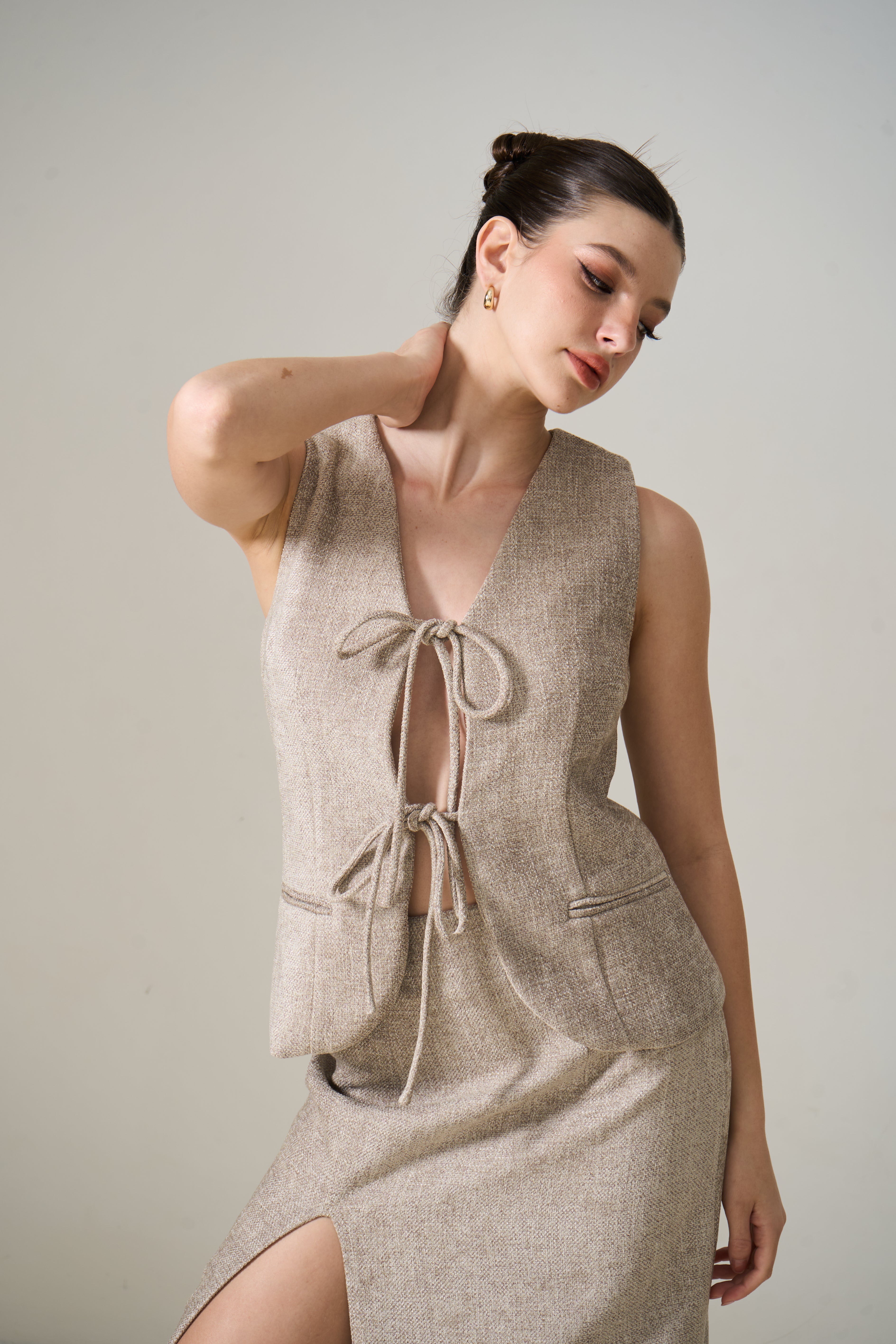 Elevate your wardrobe with the Esme Tweed Top, a statement piece that blends timeless elegance with modern sophistication. Crafted from premium tweed fabric, this sleeveless vest-style top features a flattering deep V-neckline, structured silhouette, and delicate self-tie closures for a touch of effortless charm. Designed for both versatility and refinement, the Esme pairs beautifully with our Milcah Skirt to create a polished co-ord set perfect for any occasion.