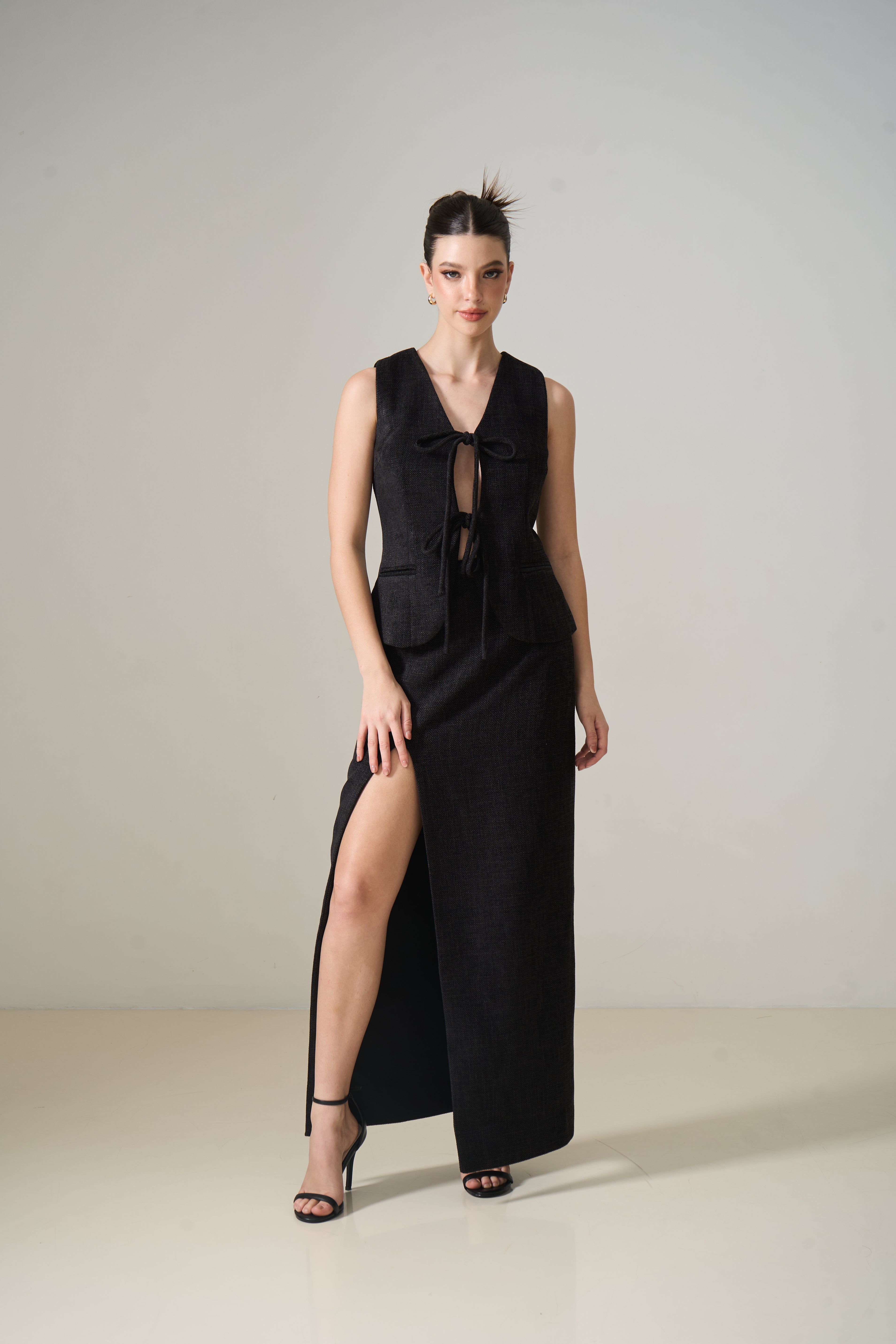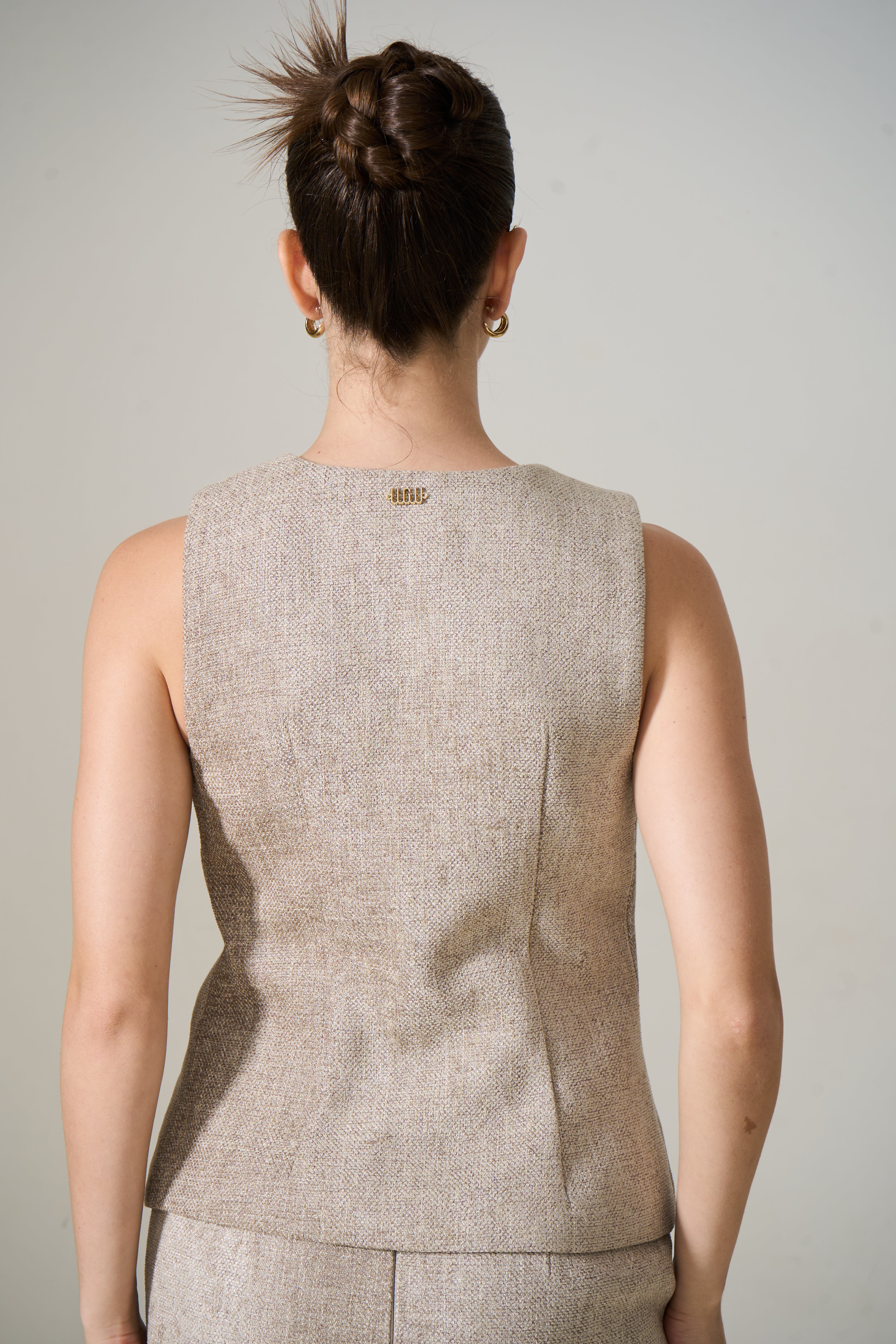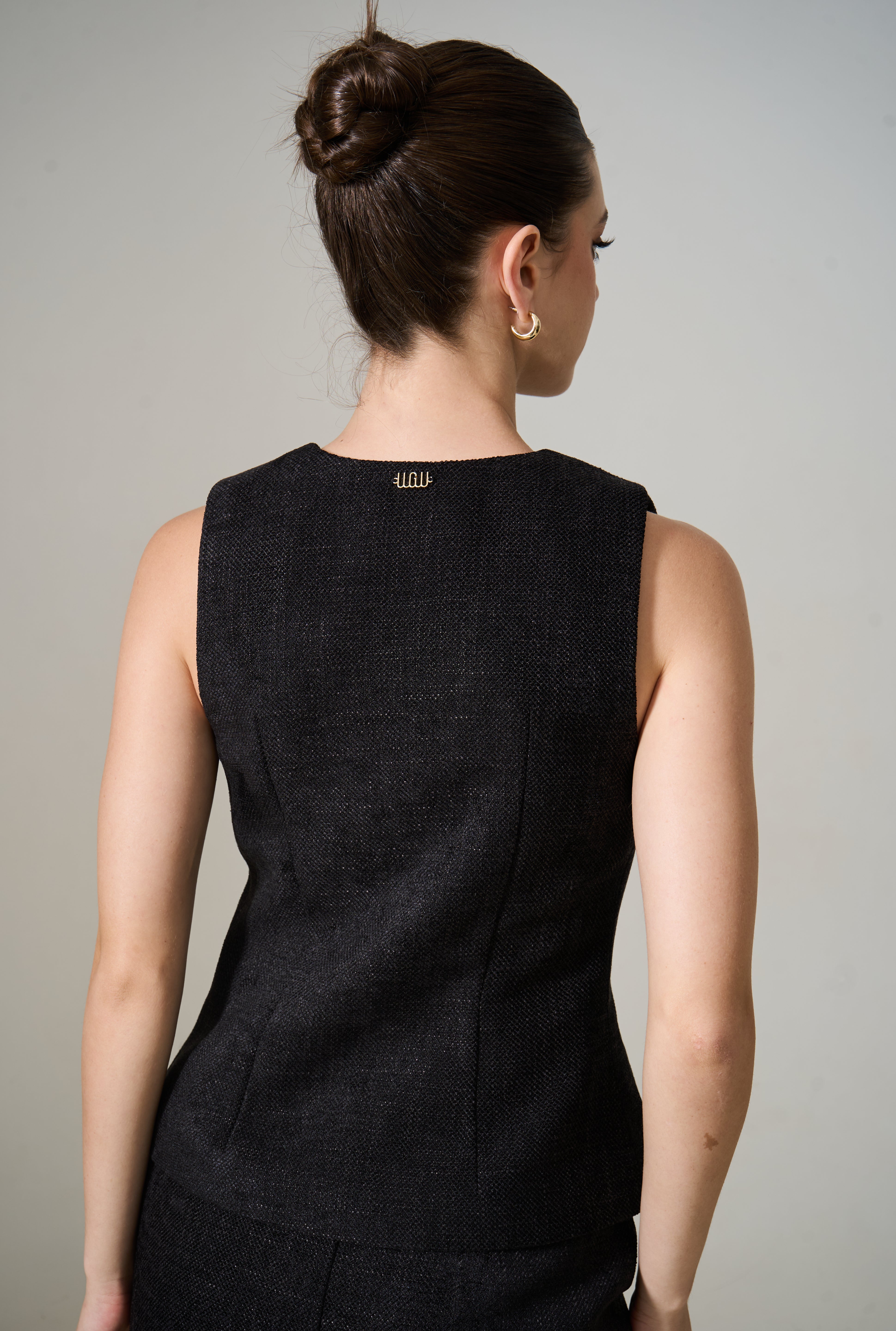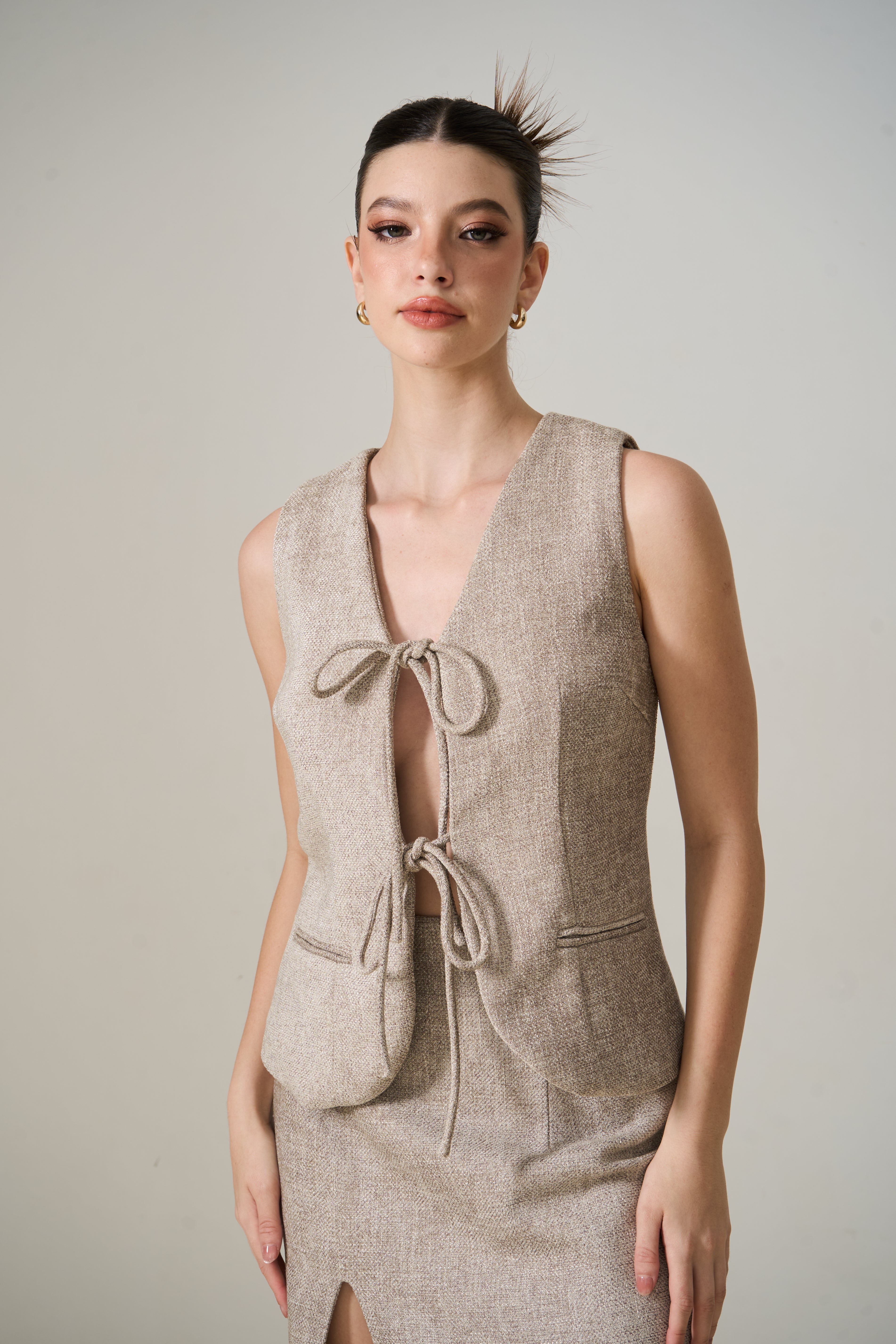 Elevate your wardrobe with the Esme Tweed Top, a statement piece that blends timeless elegance with modern sophistication. Crafted from premium tweed fabric, this sleeveless vest-style top features a flattering deep V-neckline, structured silhouette, and delicate self-tie closures for a touch of effortless charm. Designed for both versatility and refinement, the Esme pairs beautifully with our Milcah Skirt to create a polished co-ord set perfect for any occasion.