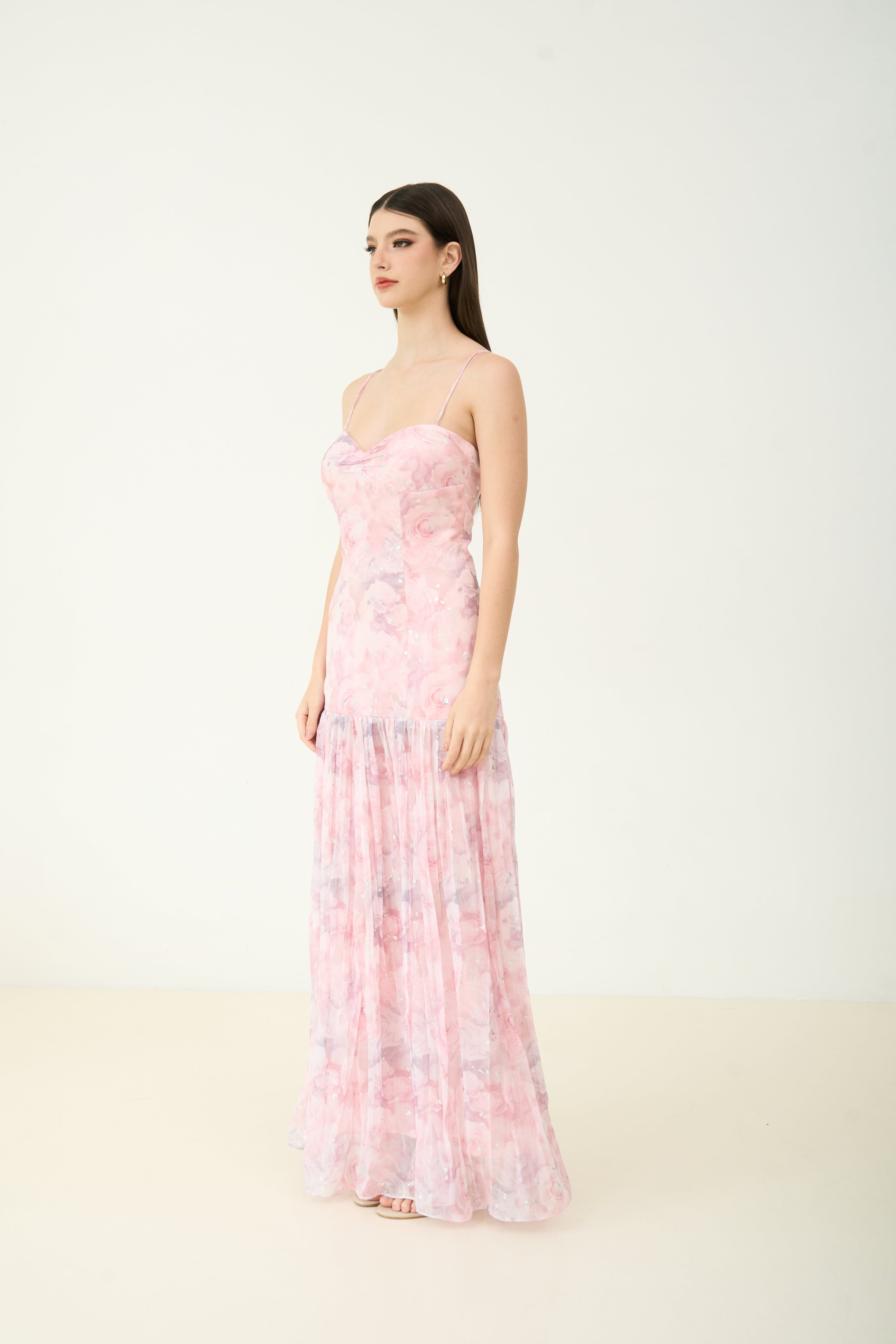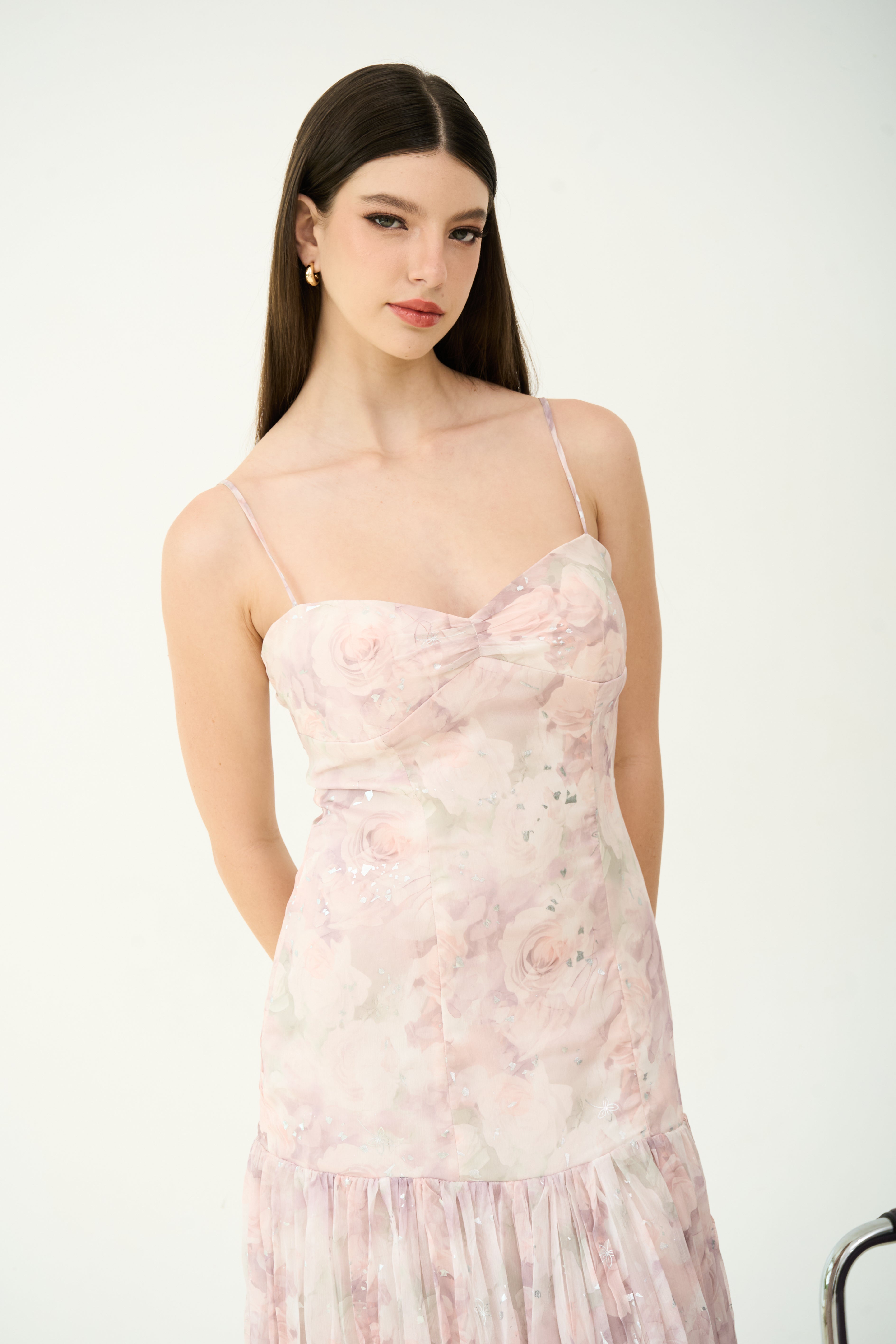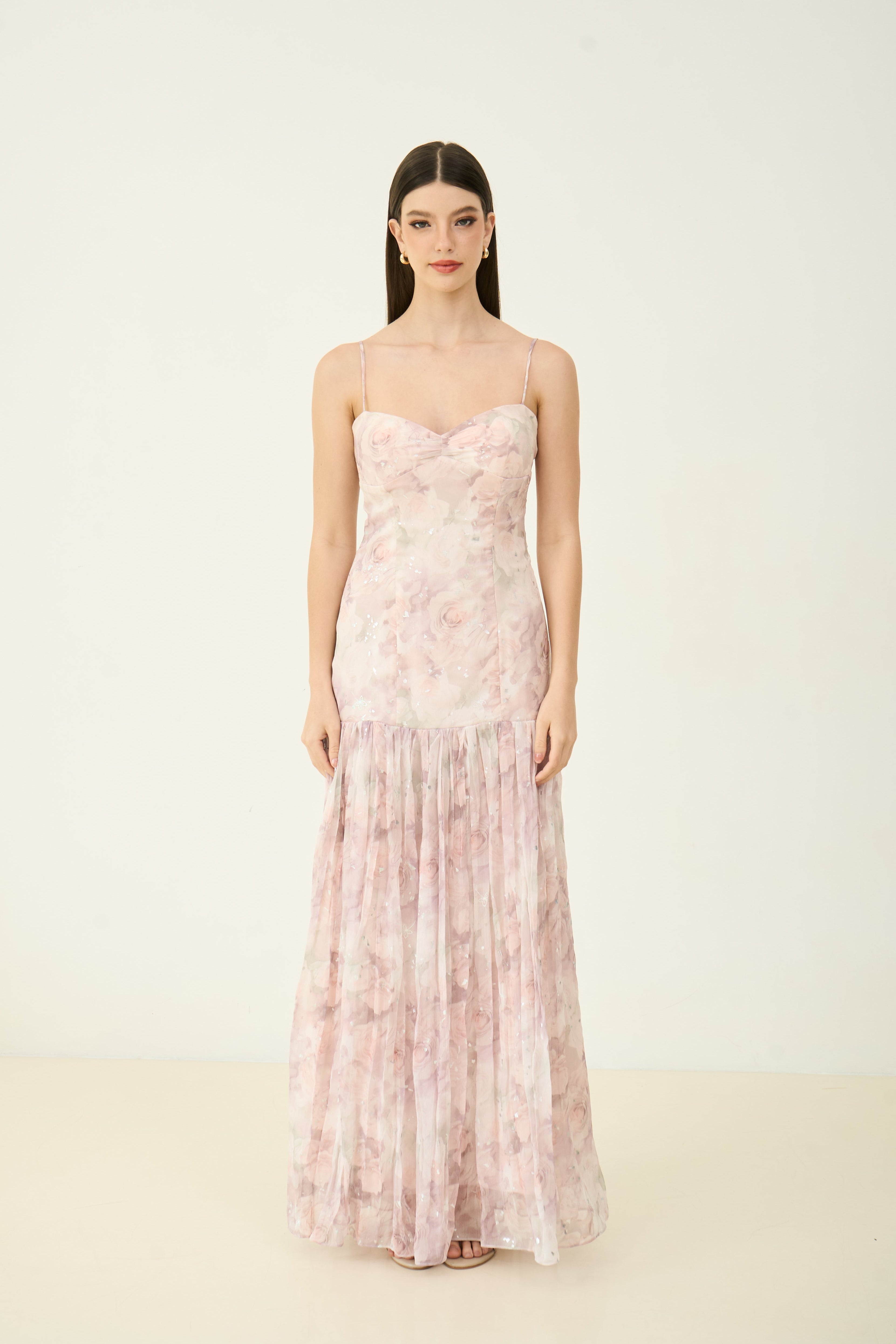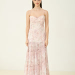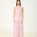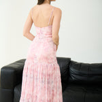 Fall in love with florals all over again in the Ivy Flow Maxi Dress. Designed in dreamy pastel chiffon, this romantic silhouette features a soft cowl neckline, pleated skirt, and delicate adjustable straps. Built-in padded cups offer effortless support and shape — no bra needed. Whether you're twirling at a summer wedding or heading to a sunset dinner, this dress brings an ultra-feminine charm to every moment.