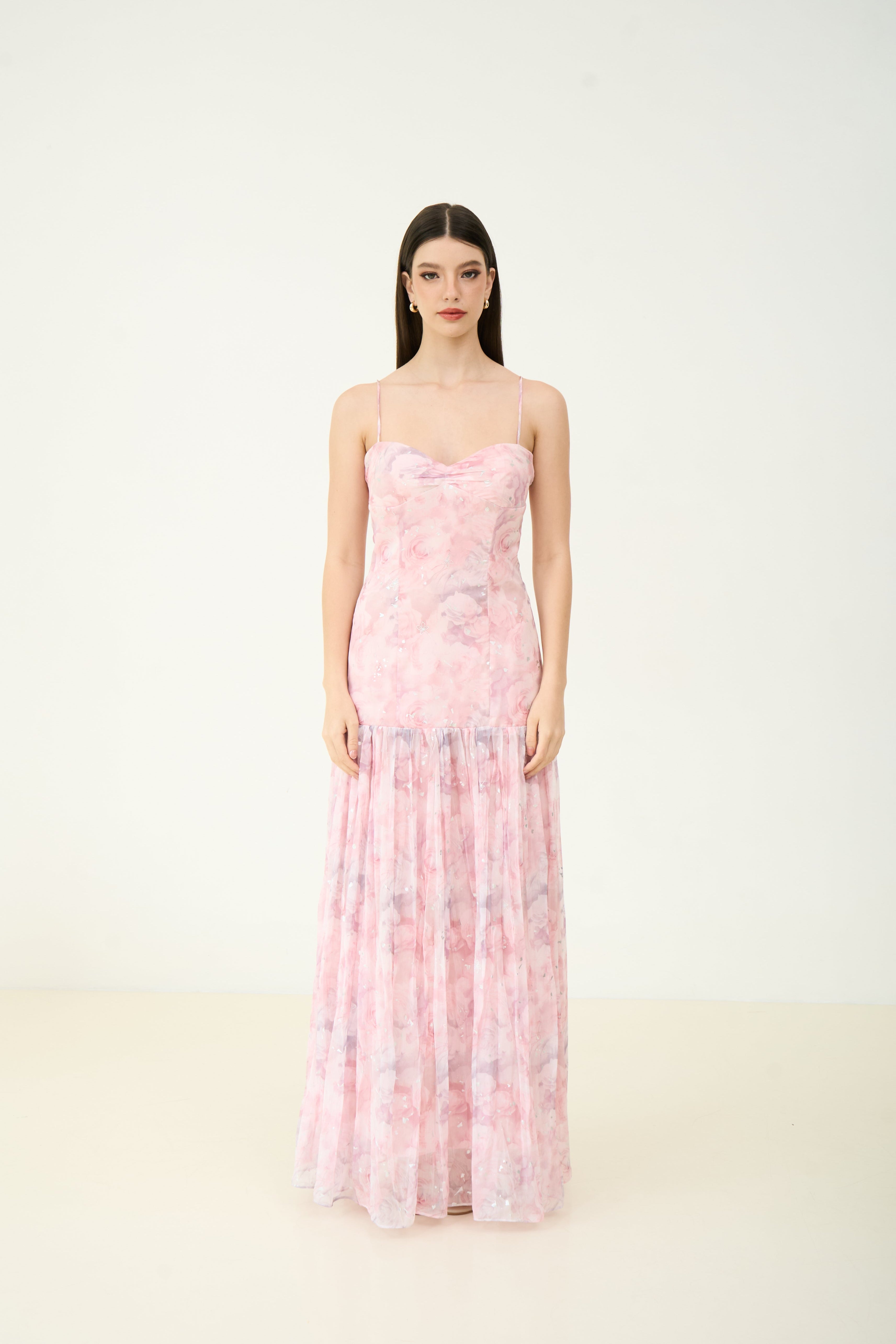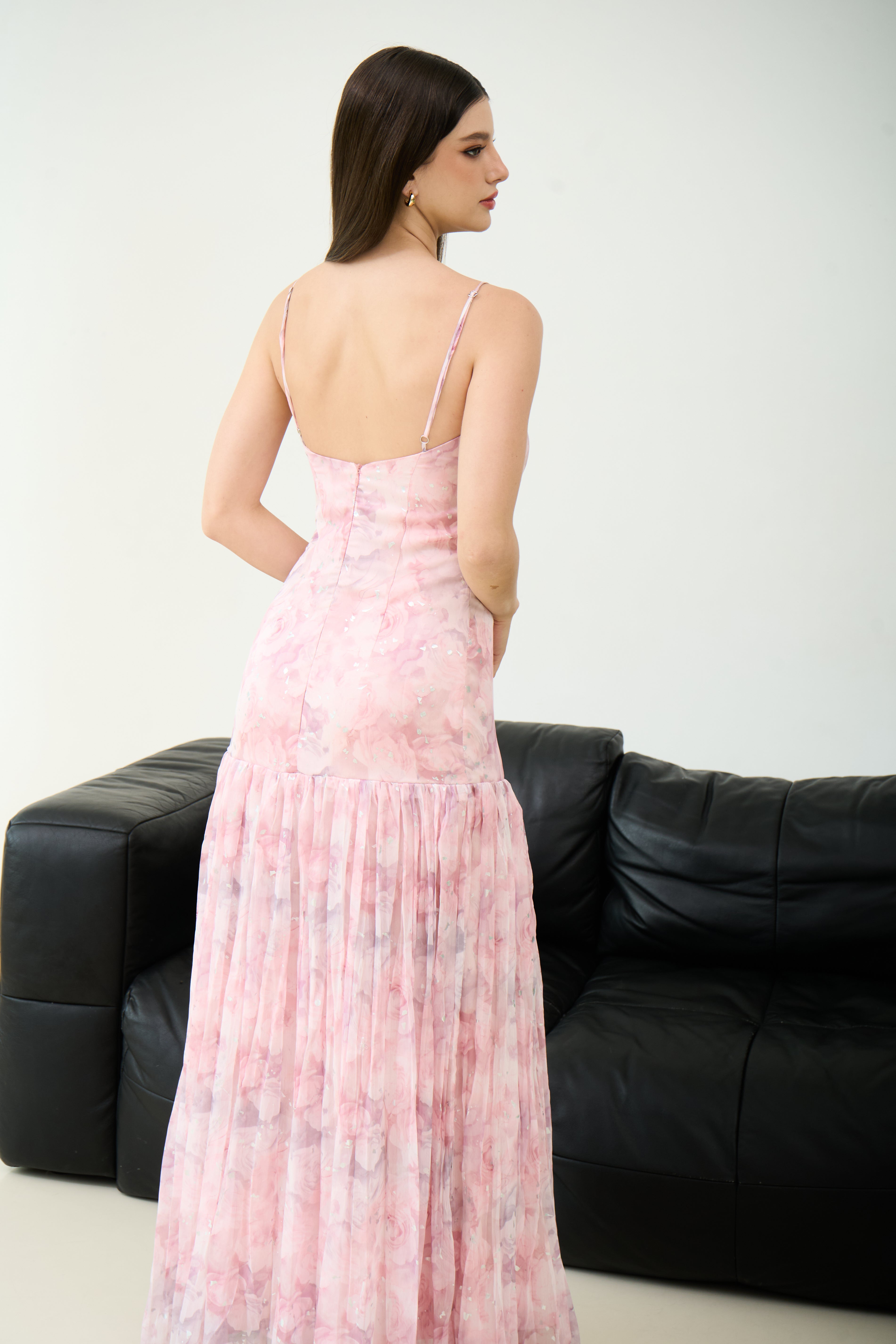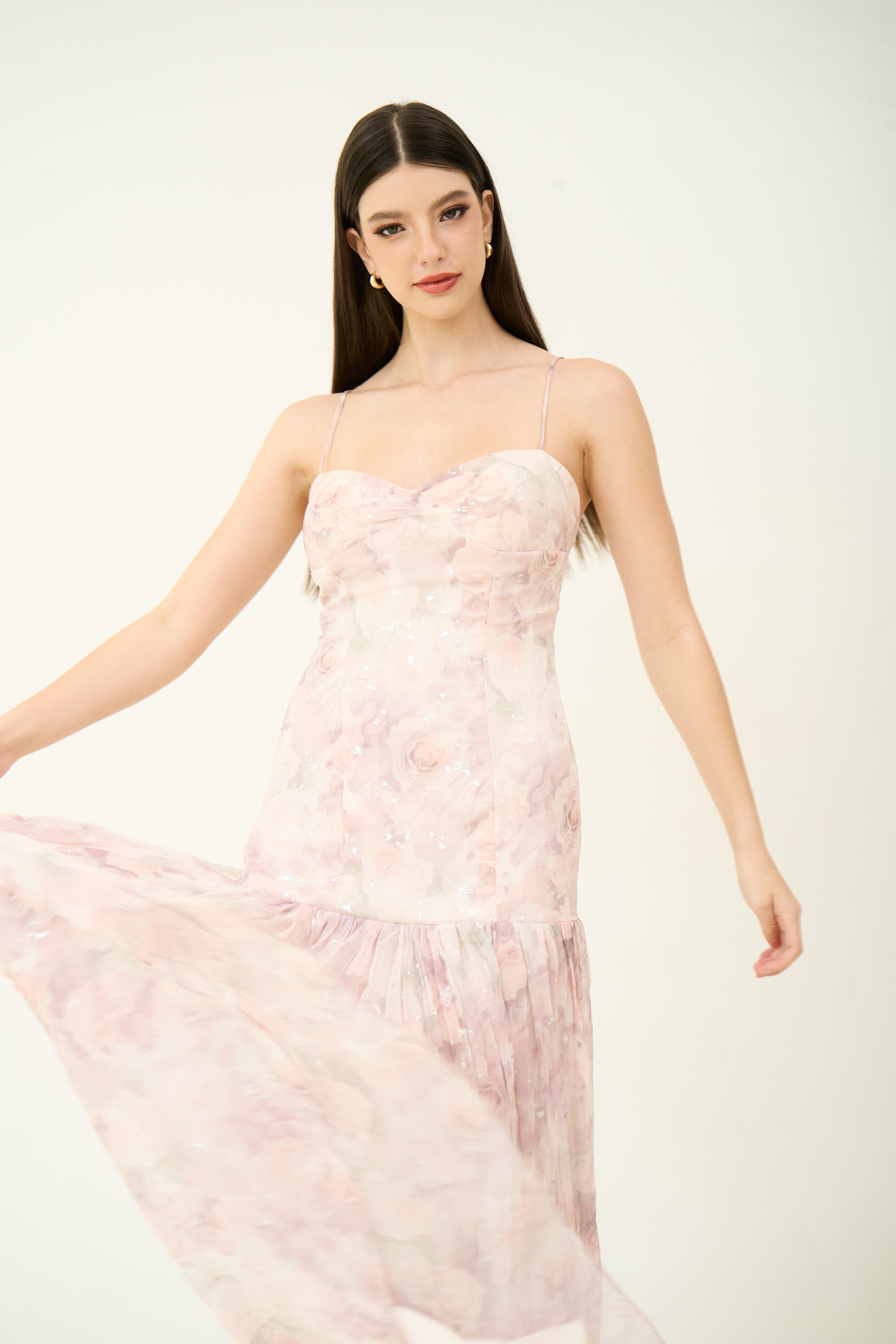 Fall in love with florals all over again in the Ivy Flow Maxi Dress. Designed in dreamy pastel chiffon, this romantic silhouette features a soft cowl neckline, pleated skirt, and delicate adjustable straps. Built-in padded cups offer effortless support and shape — no bra needed. Whether you're twirling at a summer wedding or heading to a sunset dinner, this dress brings an ultra-feminine charm to every moment.