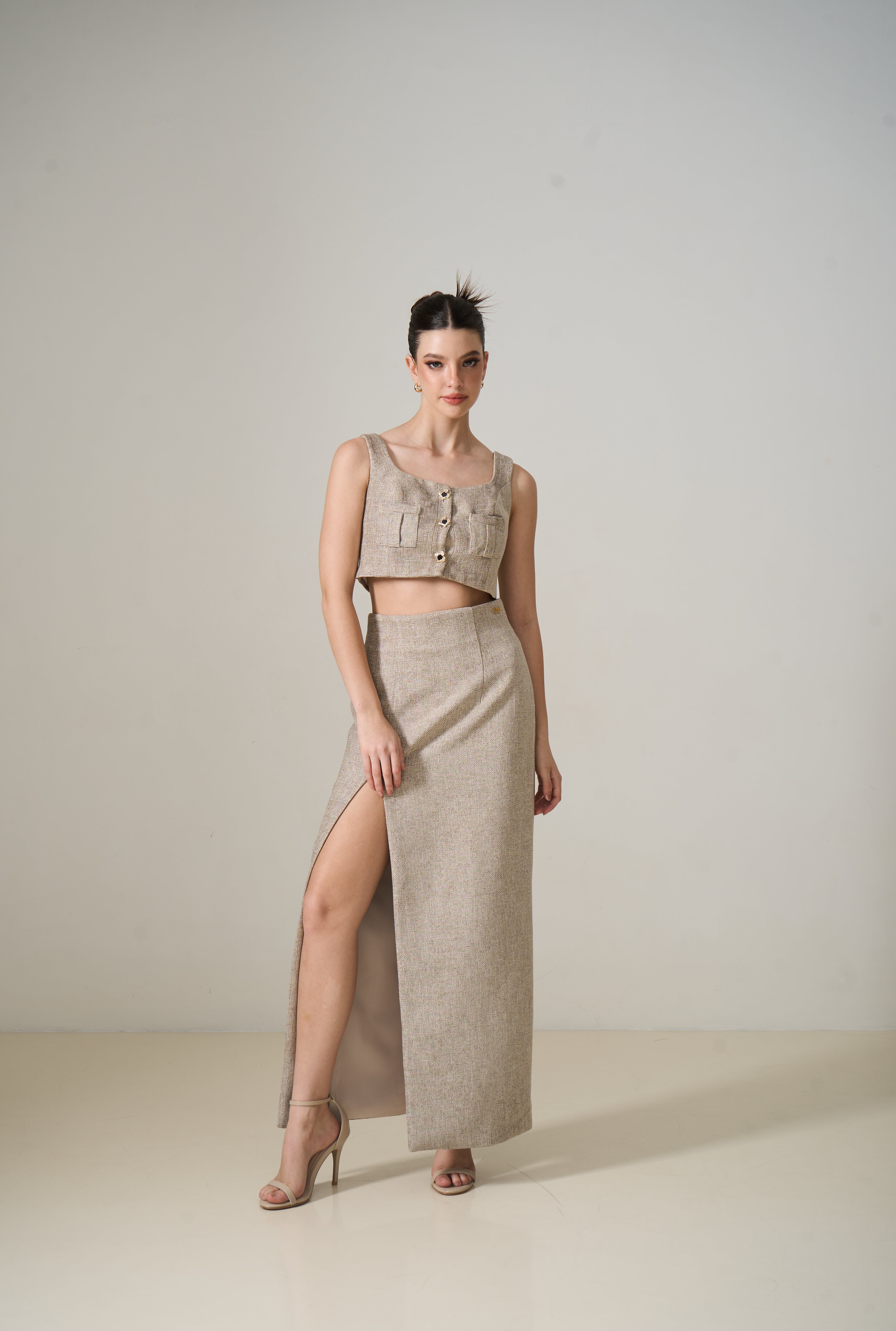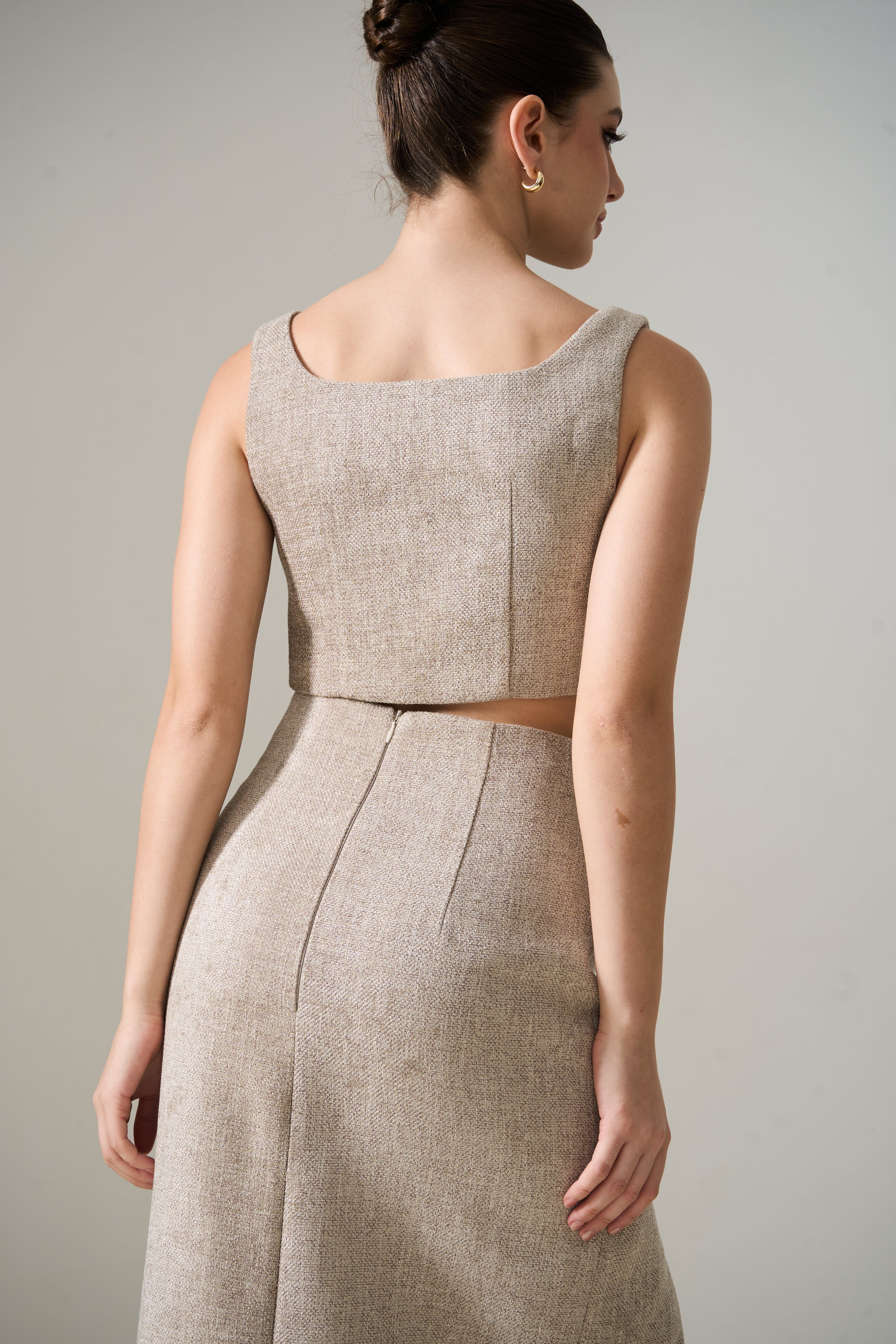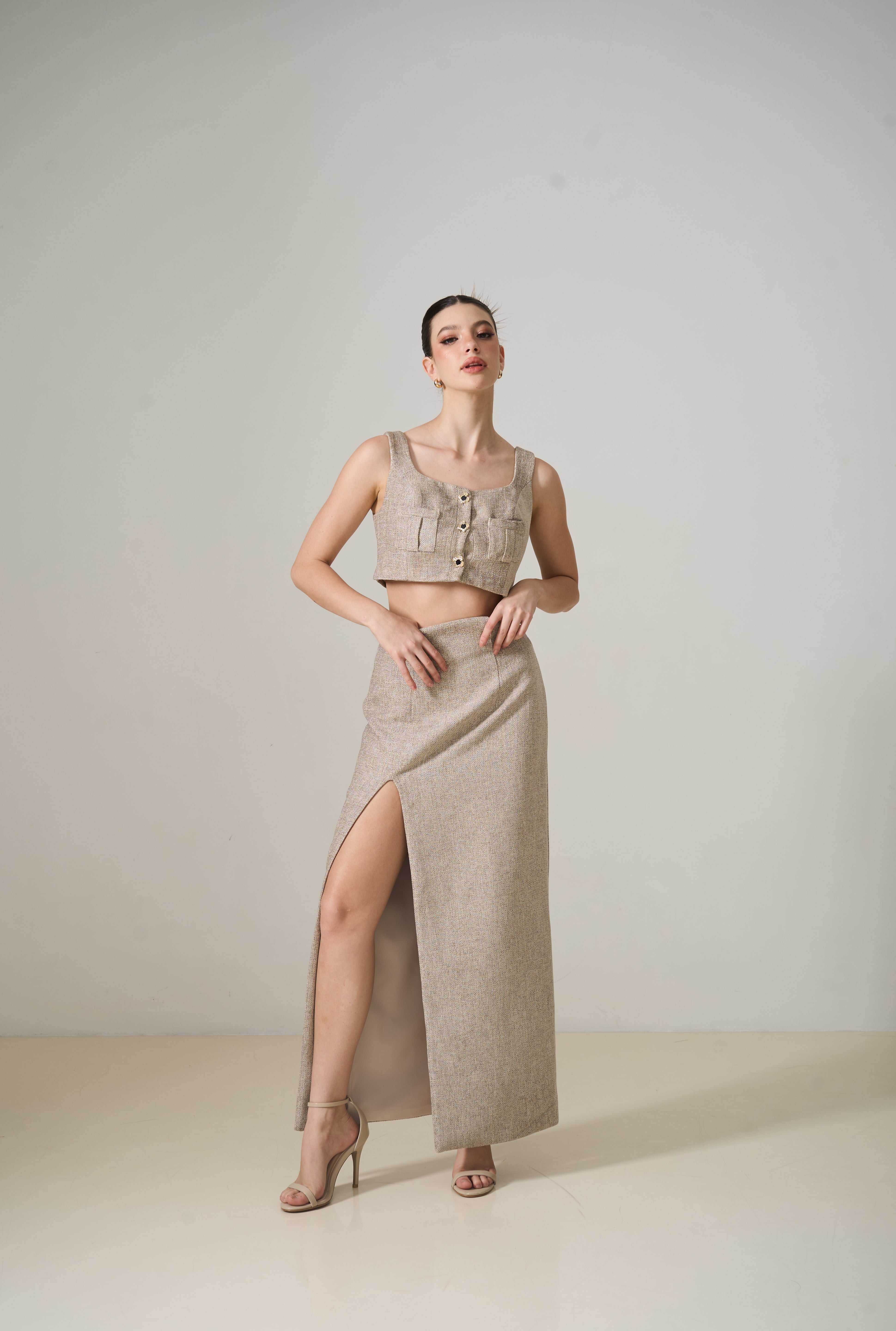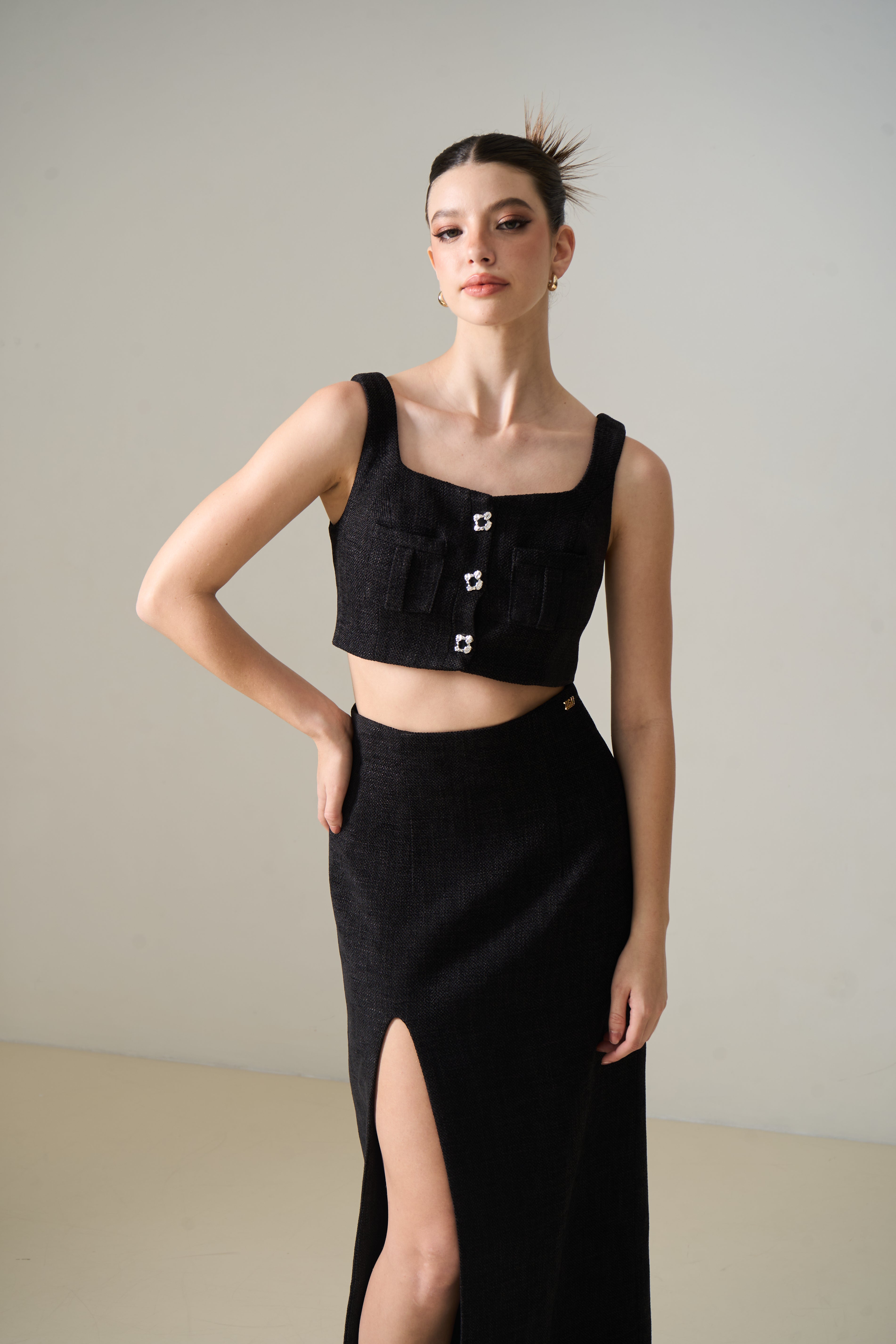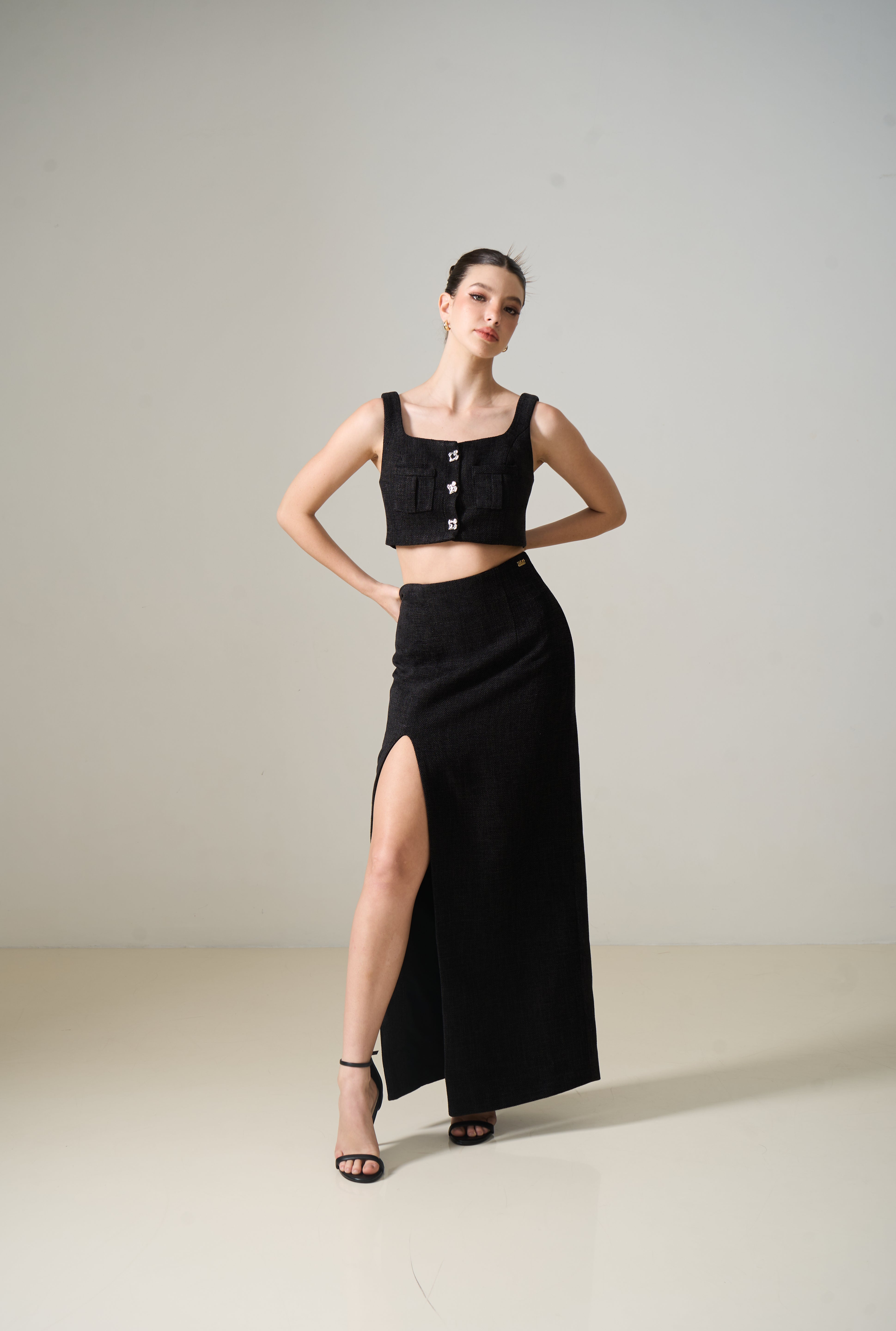 💡 Style Tip: Achieve a powerfully chic, head-to-toe tweed ensemble by pairing the Milcah Tweed Crop Top with the Milcah Tweed Maxi Skirt for a sophisticated yet fashion-forward look!