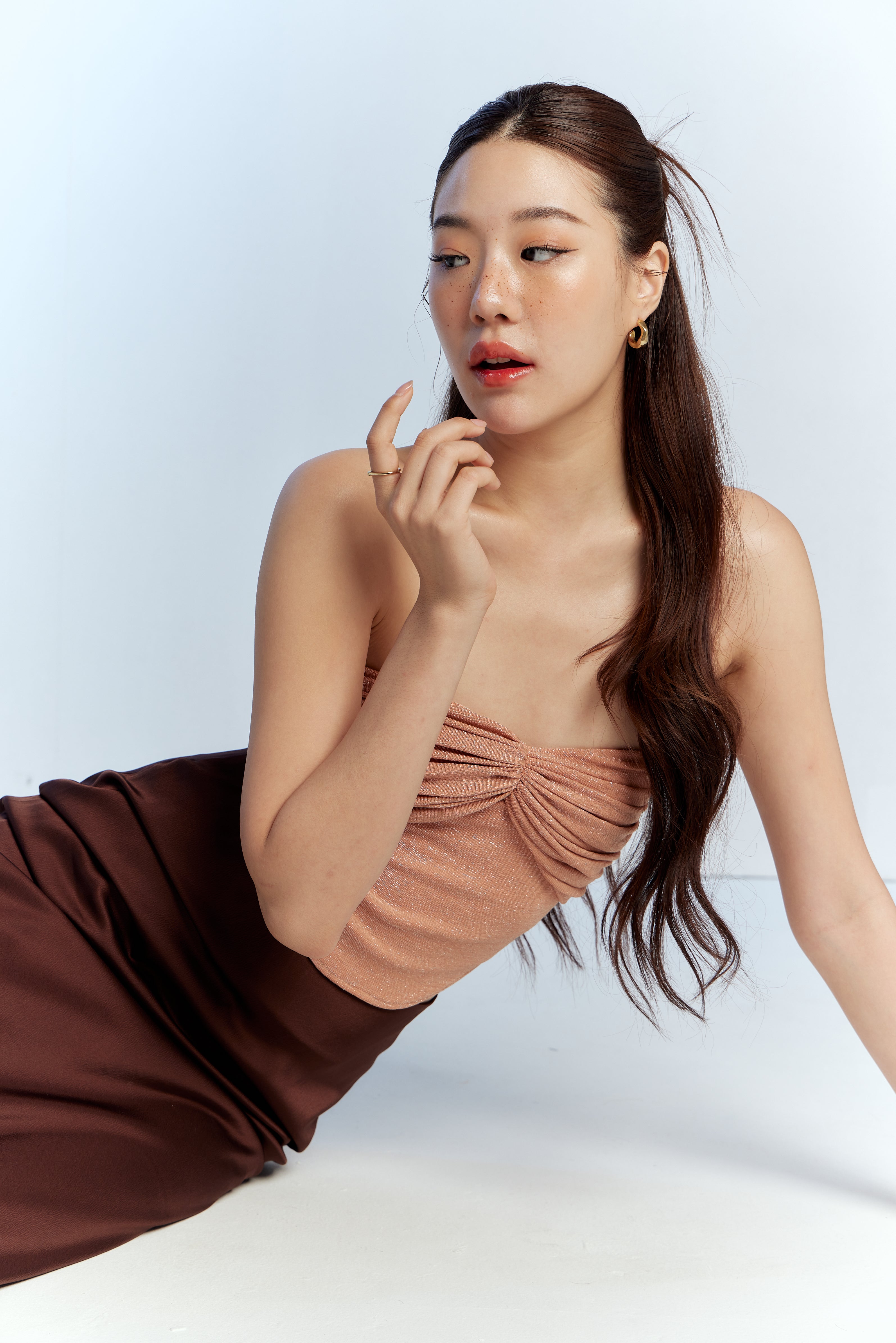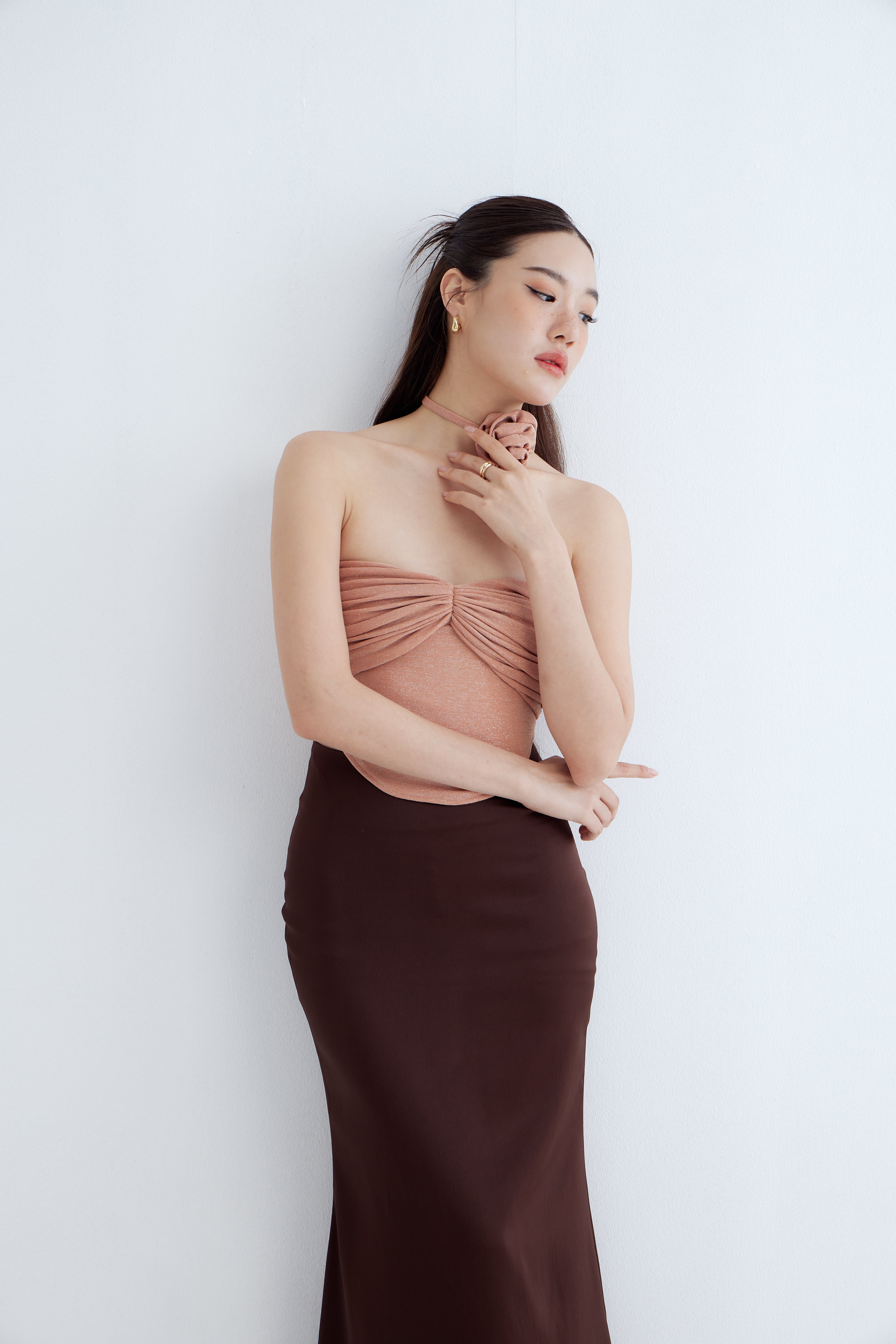 Turn heads with the Sparkle Bustier, designed to stylishly enhance your figure. Crafted from stretchy, shimmering fabric, this piece offers both comfort and style, making it perfect for any occasion. The structured ruched design adds a touch of sophistication, while the rose scarf detail creates a romantic, statement look.