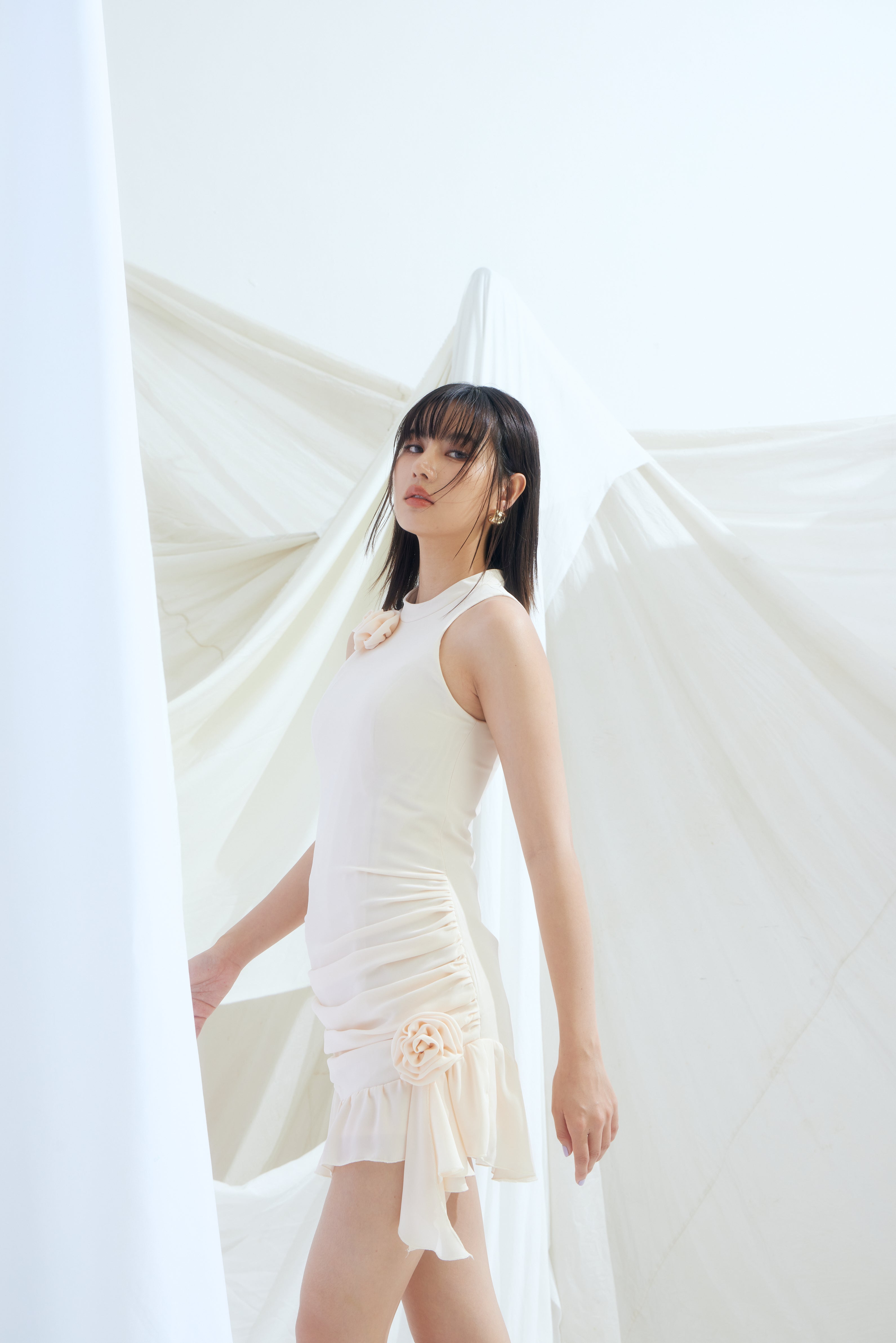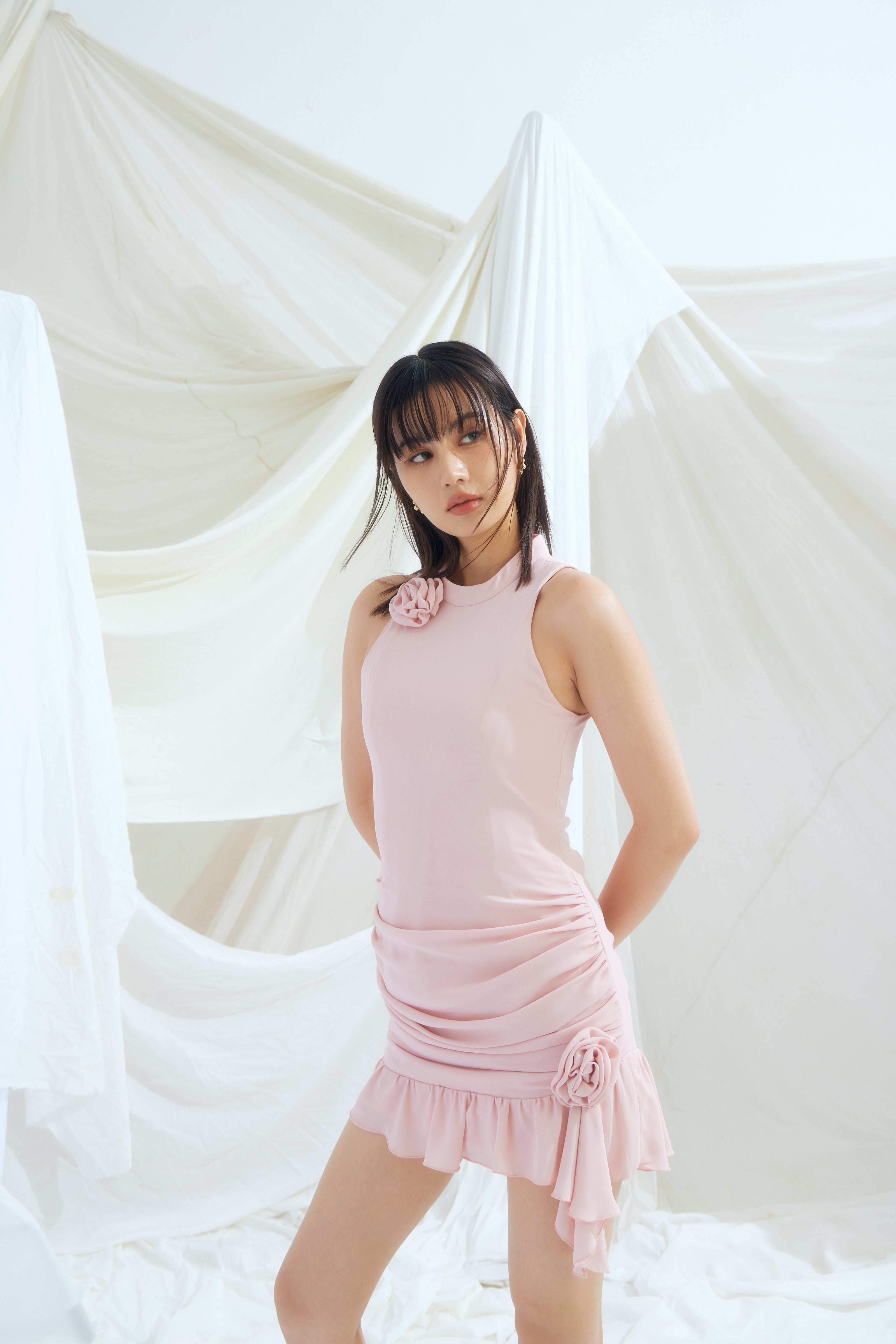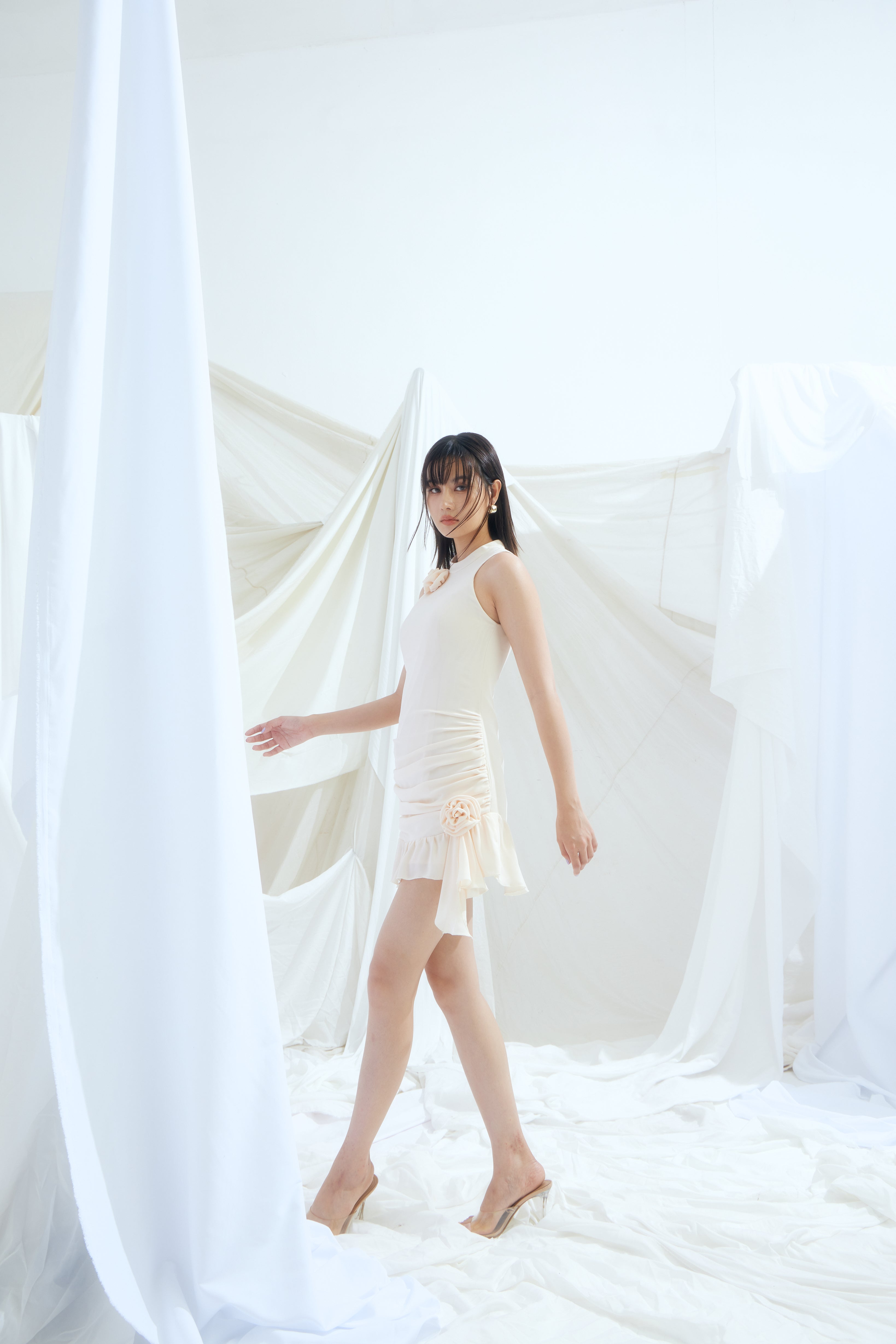 The sleeveless, high-neck design, features delicate 3D floral appliqués on the shoulder and hip, adding an eye-catching touch. The ruched detailing at the waist enhances your curves, while the asymmetrical ruffle hem creates a flirty, sophisticated finish.